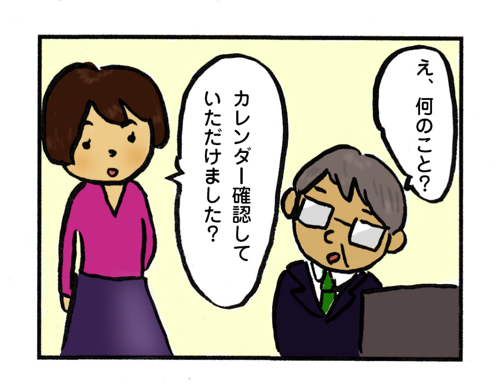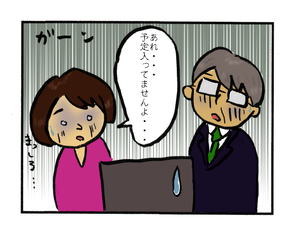 という事態は避けましょう。会議や来客打ち合わせの予定は決まった時点で入力・確認の癖をつけましょう。